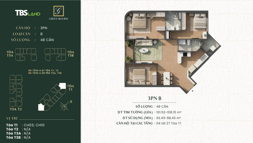 Green Skyline được giới thiệu ra thị trường với mức giá dự kiến từ chủ đầu tư chỉ từ 3,5 tỷ đồng/căn, tương đương đơn giá từ 62 triệu đồng/m². Đây được xem là mức giá cạnh tranh và hợp lý trong phân khúc căn hộ cao cấp tại khu vực Dĩ An, Bình Dương.