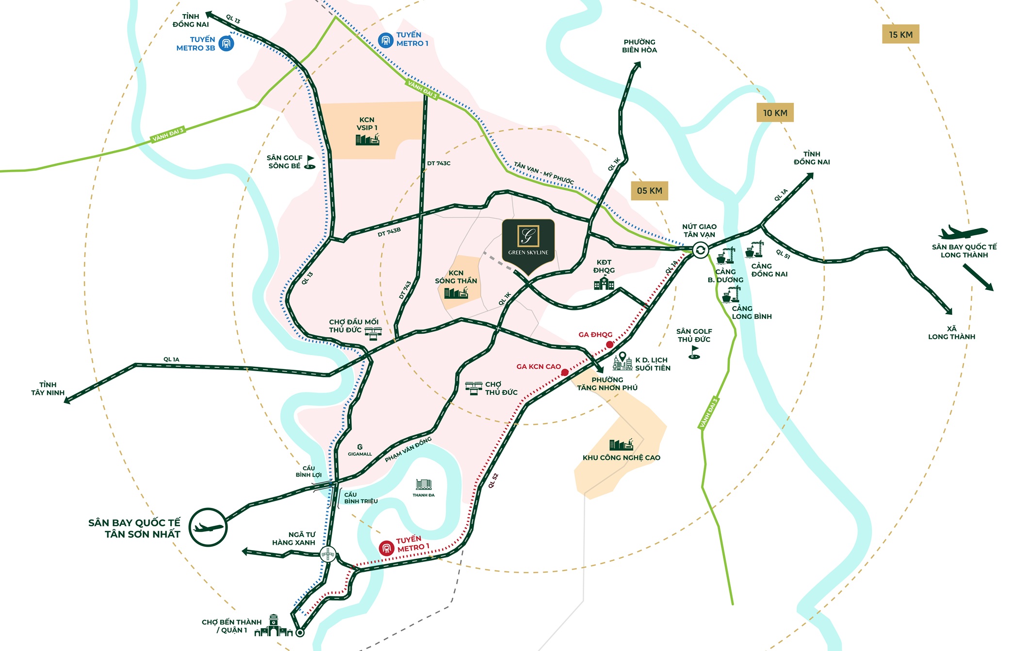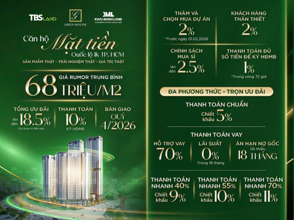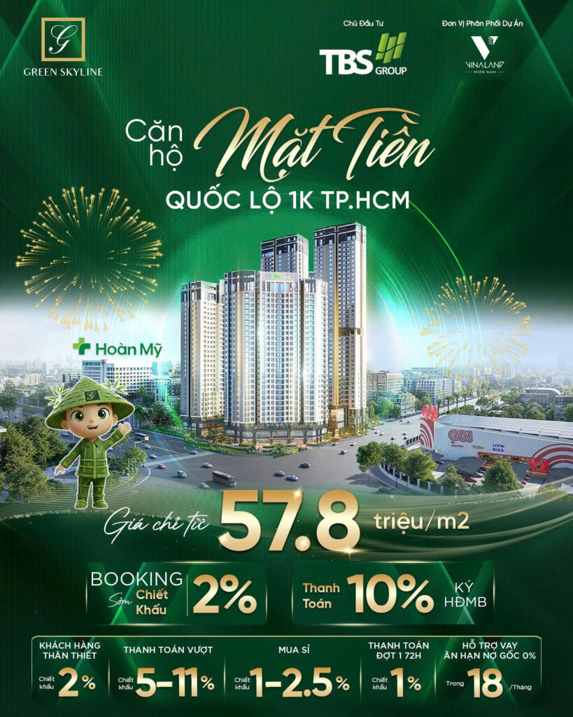 Green Skyline tọa lạc tại vị trí mặt tiền nút giao ngã ba Quốc lộ 1K và đường GS1, thuộc phường Đông Hòa, Dĩ An. Dự án sở hữu thế đất giá trị “mặt hướng lộ”, nằm ngay cửa ngõ kết nối giao thương trọng điểm giữa Dĩ An – TP. Hồ Chí Minh – Biên Hòa, mang đến lợi thế vượt trội về giao thông, thương mại và tiềm năng gia tăng giá trị.