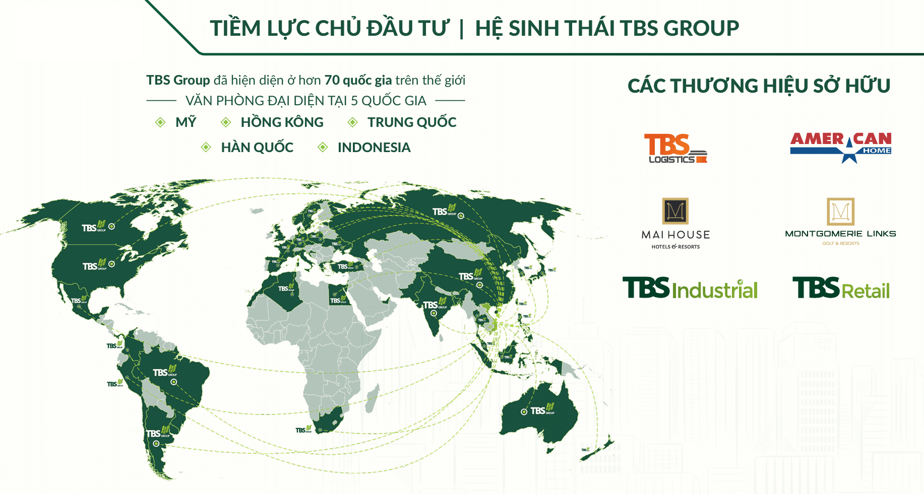 TBS Group đã hiện diện ở hơn 70 quốc gia trên thế giới VĂN PHÒNG ĐẠI DIỆN TẠI 5 QUỐC GIA : MỸ – HỒNG KÔNG – HÀN QUỐC – TRUNG QUỐC – INDONESIA